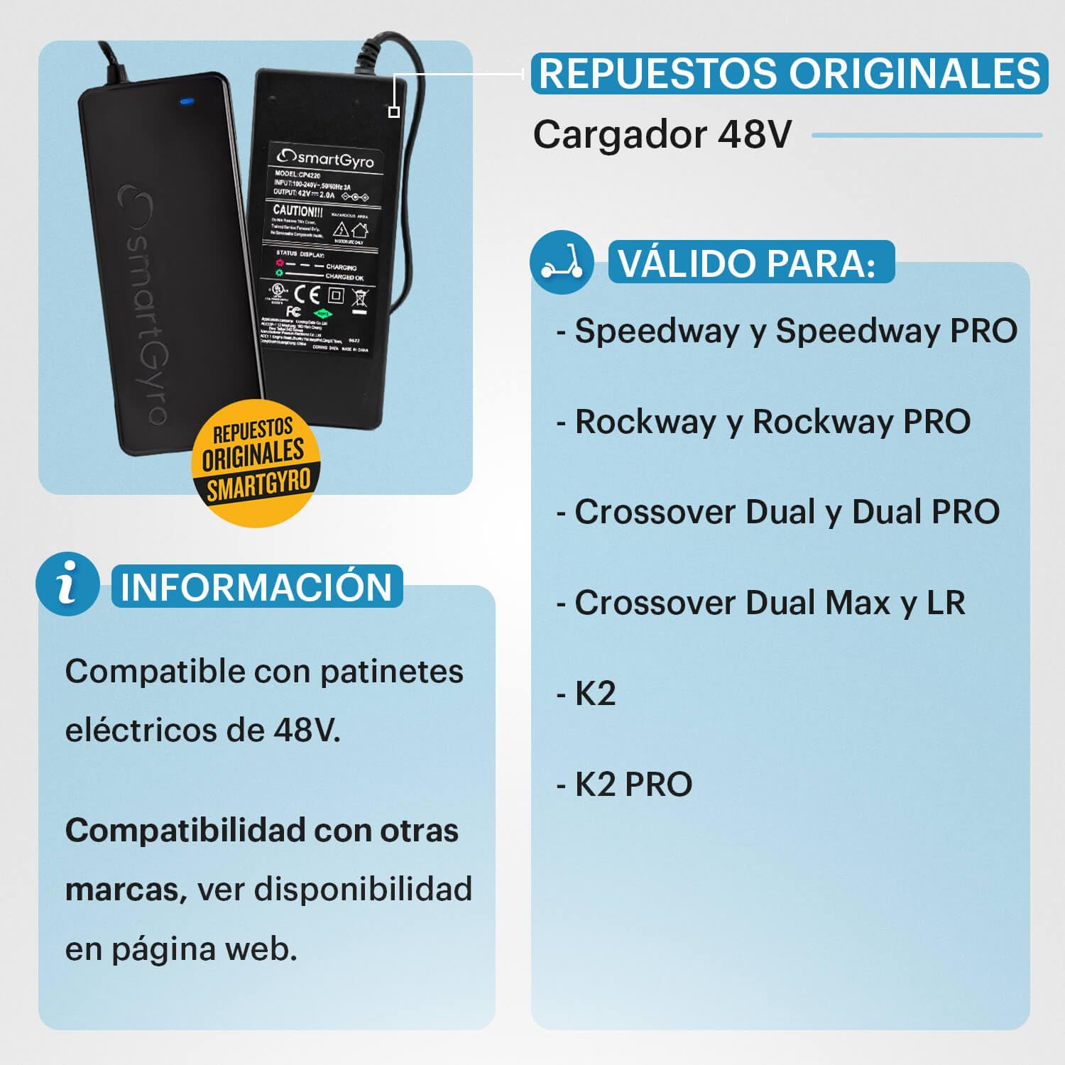 Cargador Patinete Eléctrico SmartGyro Original 48V (54,6V